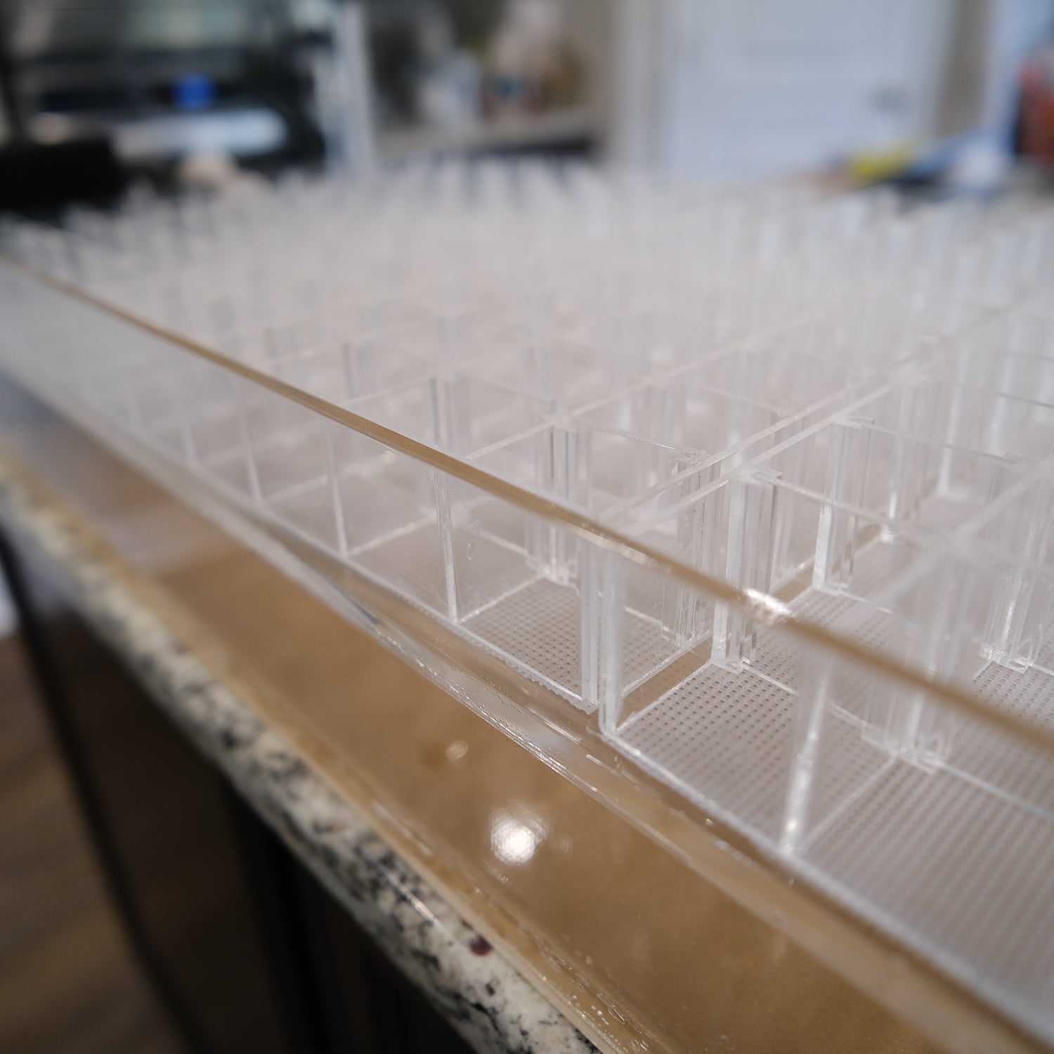 MartinMorphisis systems are custom-built and assembled using 1/4” acrylic for the main bodies of the system and 1/8” acrylic for the trays of cubicles. All joints of the main body of the systems are reinforced with 1/2” triangular braces resulting in robust and rugged construction.