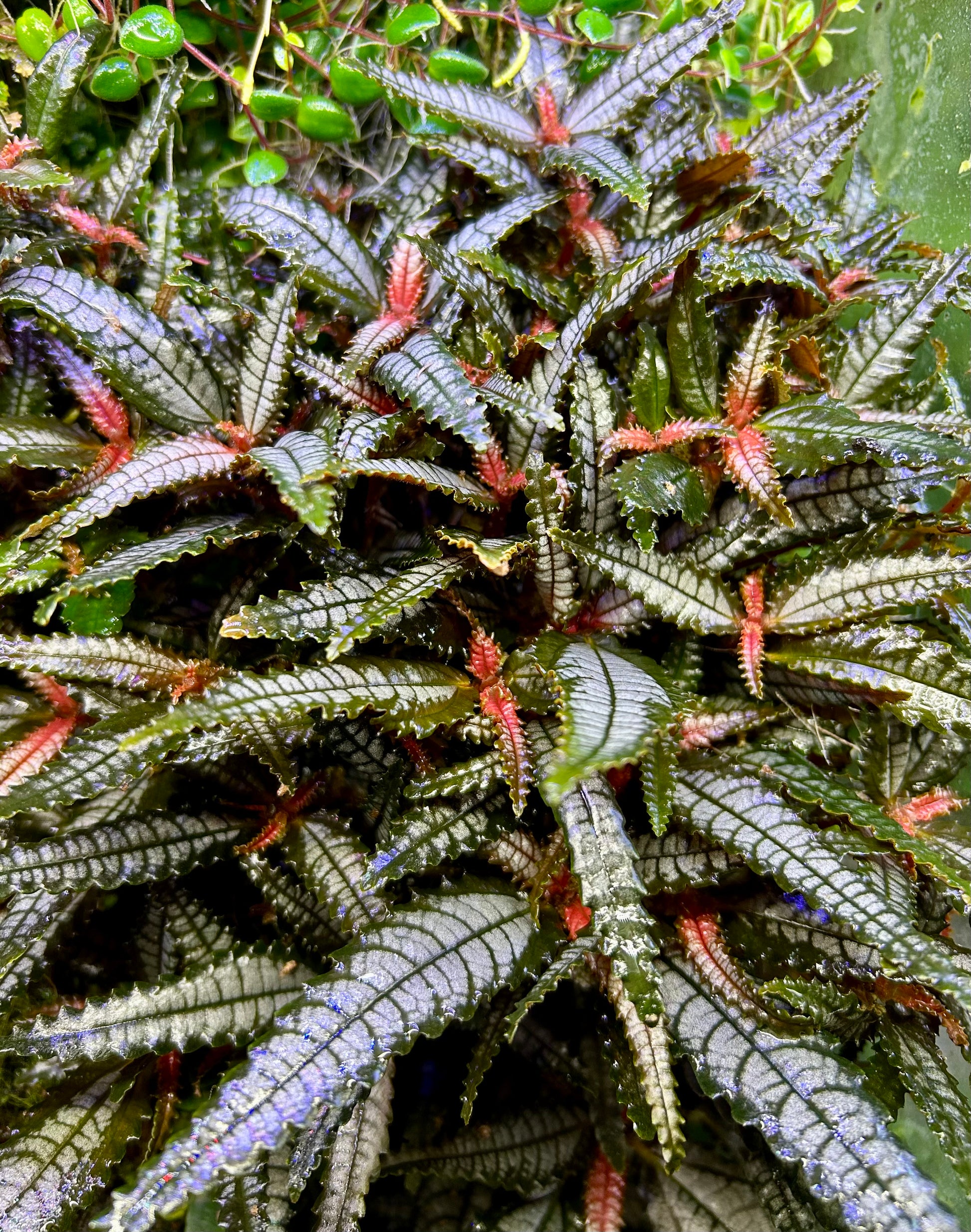 This Pilea plant easily thrives in vivariums. The long dark leaves provide a great contrast against the abundance of green common to most plants. The growing tips of the plant often turn red, especially under brighter illumination. This plant produces aerial roots and is easy to propagate via cutting the stems and replanting them.