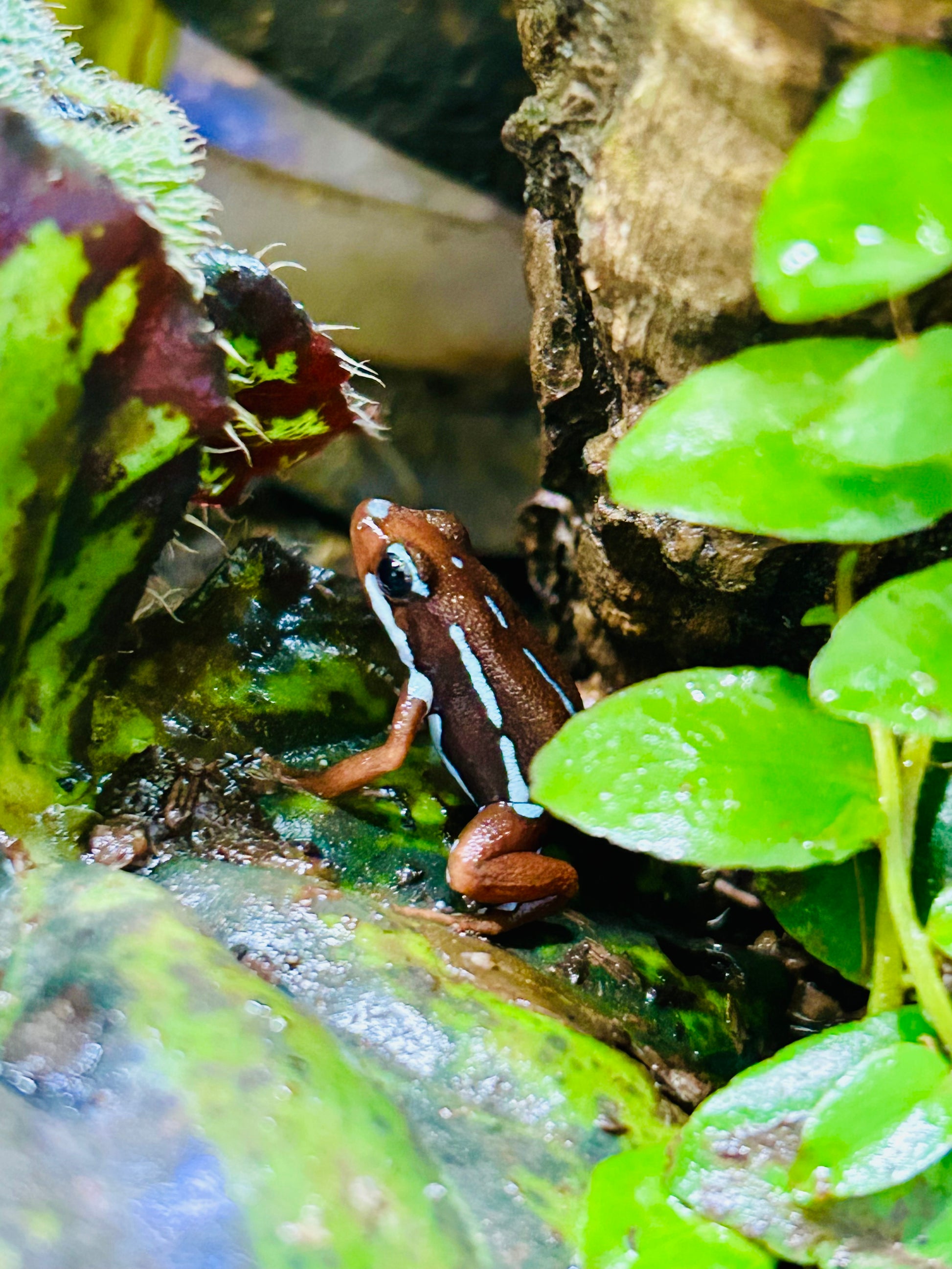 A very bold and prolific Dart Frog, Ankas can be kept in groups, and in time will form a peaceful colony. These frogs have a dark rust-red coloration with irregular light stripes. As the frogs mature these stripes often change from white to an iridescent blue color. Males have a relatively loud call, and will guard their clutch of eggs after mating with a female. Upon hatching the male will transport his tadpoles to a body of water for them to grow and develop. The tadpoles can be raised communally.
